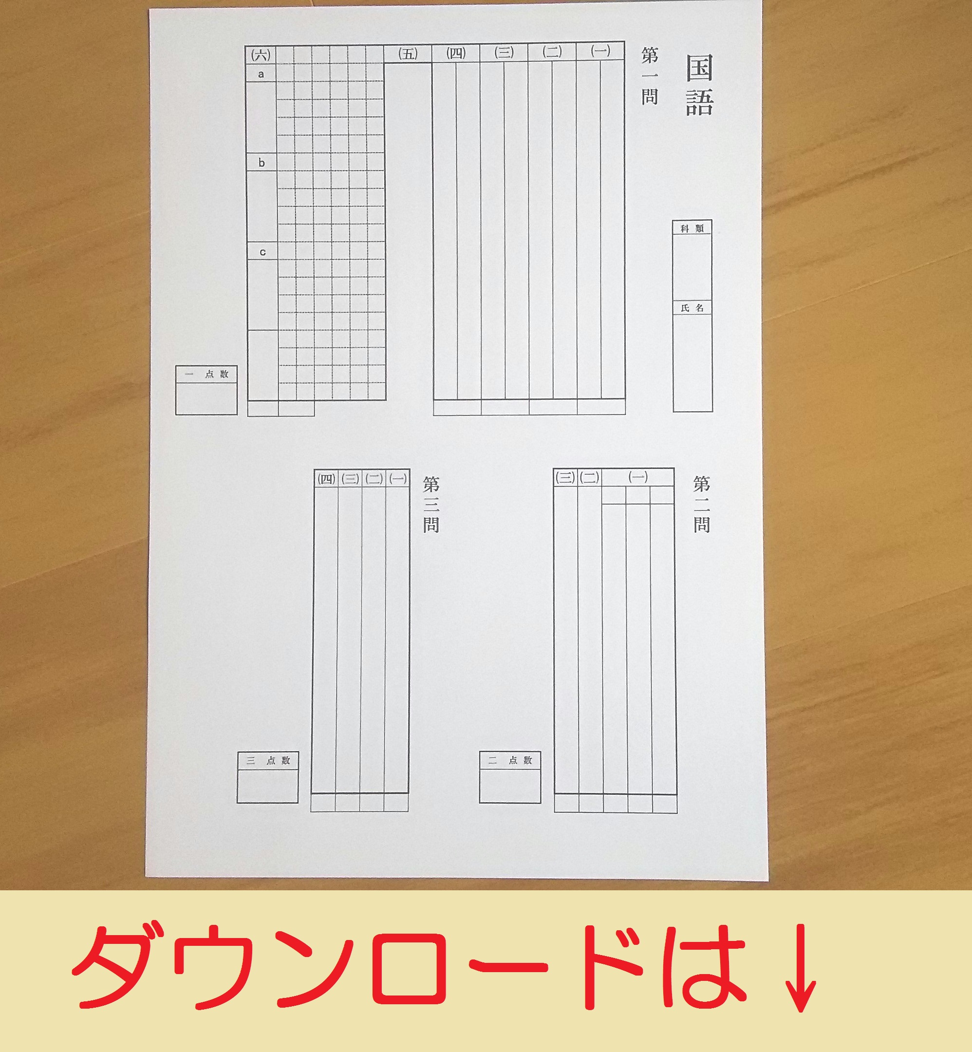 ホーム弱小公立から東大へ 【DL可】東大理系国語解答用紙 2017年3月18日2022年1月16日 SHARE ツイート シェア はてブ LINE Pocket 東大模試や東大赤本用に、東大国語(理系)の解答用紙作った。 東大君によると、本番は1枚で全部まとまってた、古文漢文はそんなにスペースがない、 解答ちょうどぐらい、ってことやったから、ちょっとちまっとした感じに。 東大理系国語解答用紙ダウンロード A3で印刷で。 東大国語でやること に戻る 2017年3月18日【DL可】東大英語解答用紙 2017年3月18日【DL可】東大理系国語解答用紙 2017年3月18日【DL可】東大物理解答用紙、東大化学解答用紙 2017年3月8日【DL可】東大理系数学解答用紙